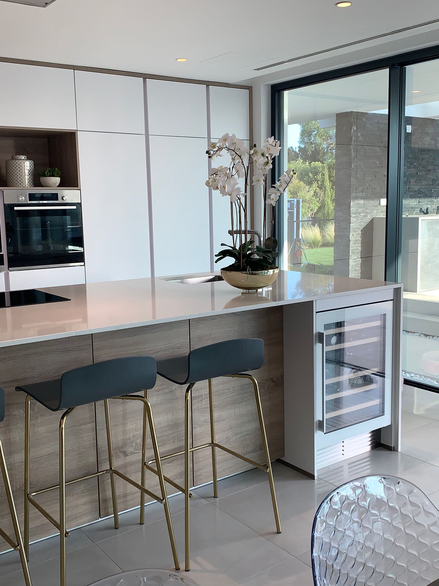 The Interior Design of this new build started as soon as the building began to take shape. The Villa has a contemporary design, so I wanted to keep the scheme mainly neutral in the main living areas but added touches of gold to the natural textures of the wood and stone.